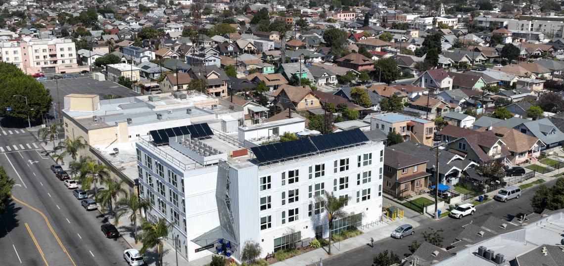 Located at 5138 S. Broadway is South Los Angeles, the project was built in partnership with Aedis Real Estate Group and Hoffman Management and Construction Corporation, and consists of a four-story building featuring 49 apartments on a corner lot. The housing on the second, third, and fourth floors is capped by a rooftop deck, while resident amenities and supportive services are located at street level.